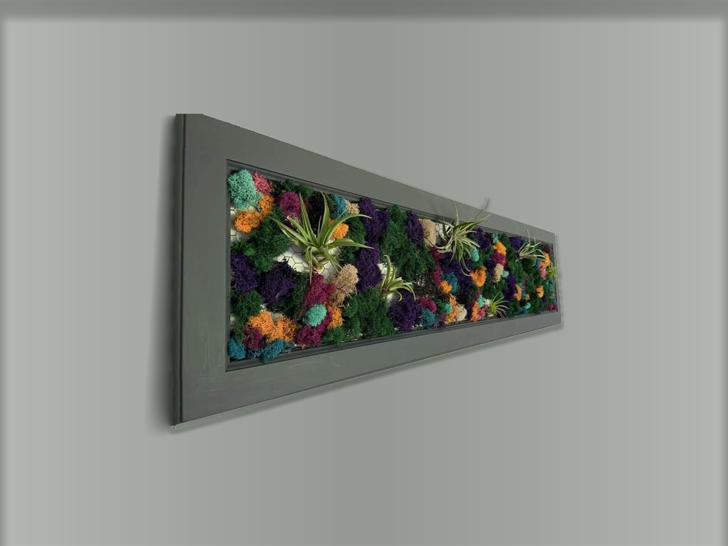 "More Moss" This living artwork was designed to match clients' colourful contemporary style, coordinating with colours, furniture, and other artwork curated by Florence Design Co. A re-purposed kitchen cabinet door was painted, new wire installed, curated dried moss placed and living air plants integrated for a truly unique living art piece!