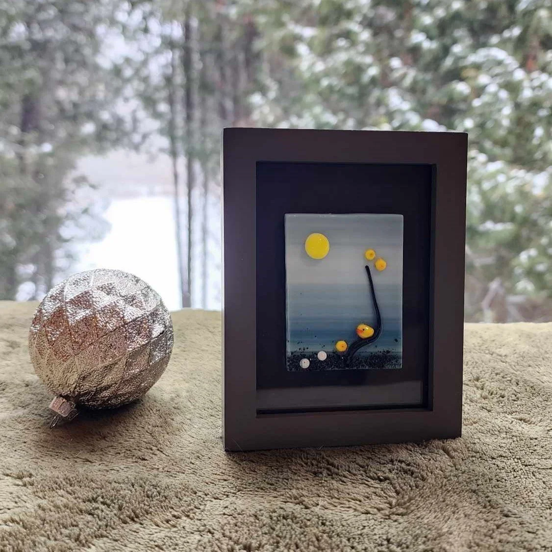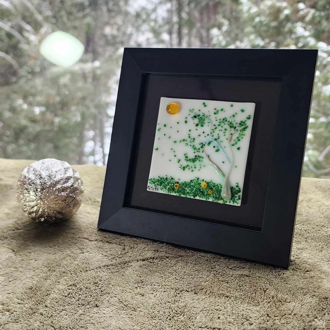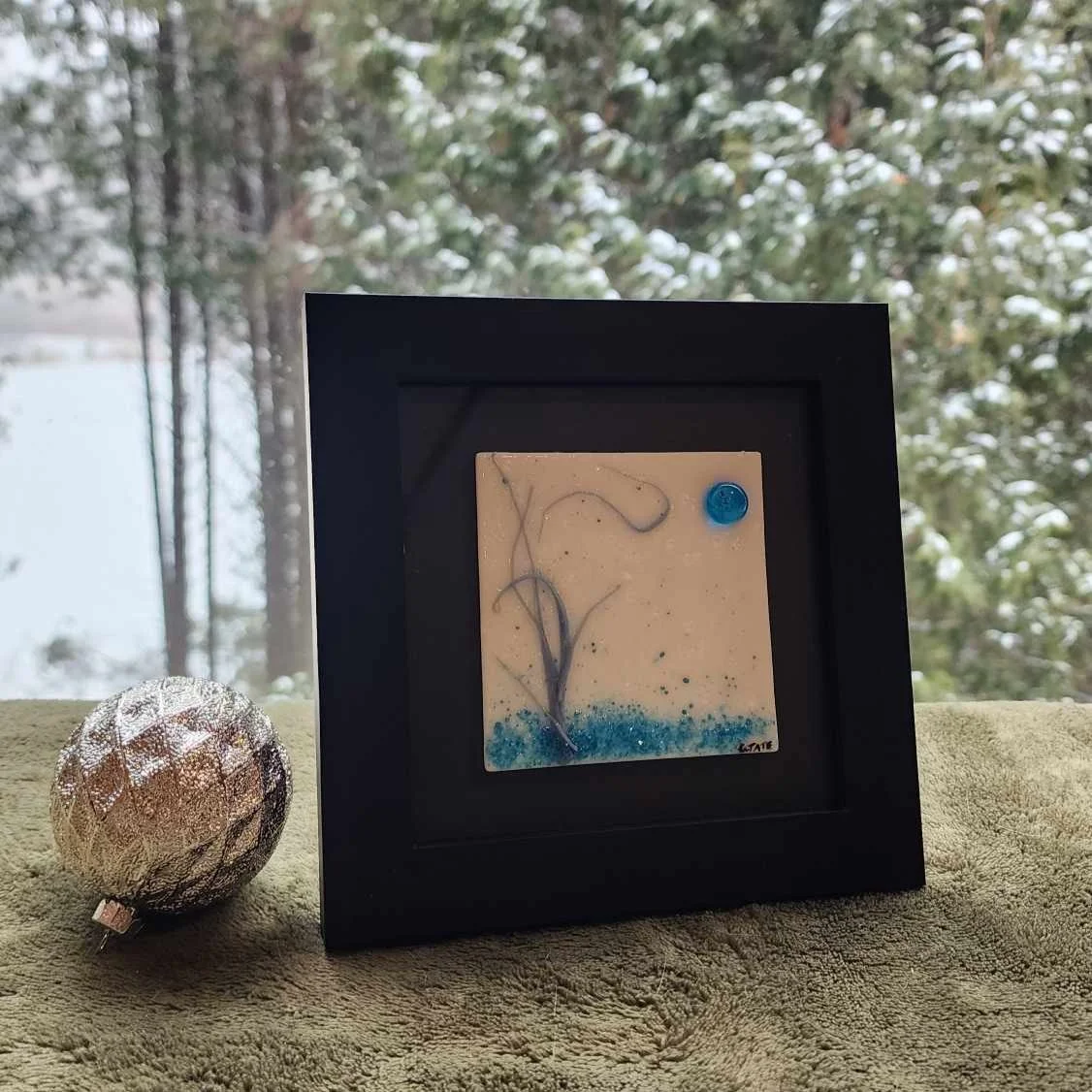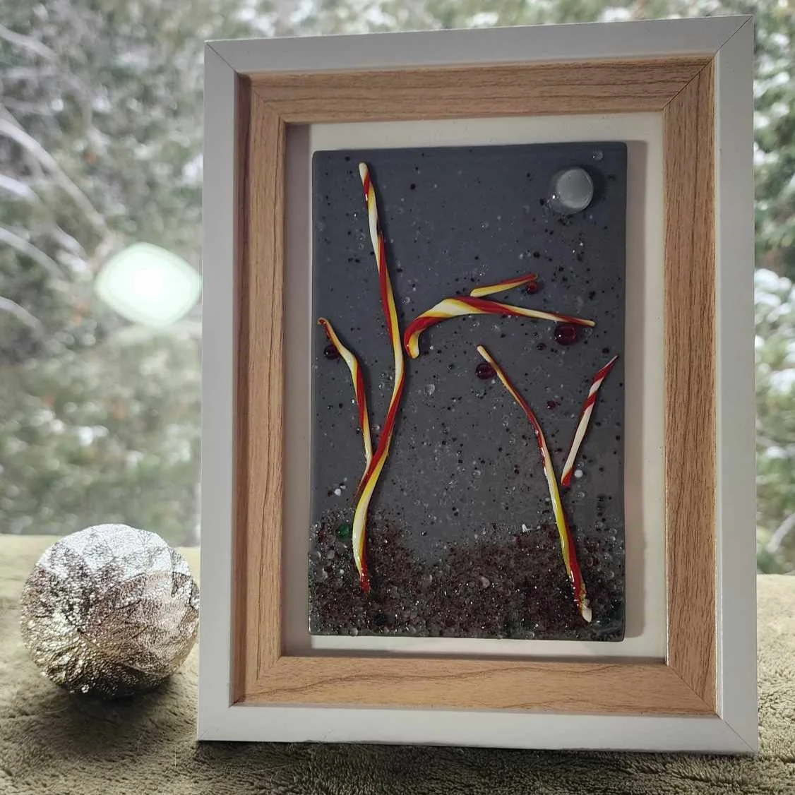 Inspired by Ontario’s “White Fish”, this piece is composed of solid, variated, and sparkly coloured glass scrap layers.
