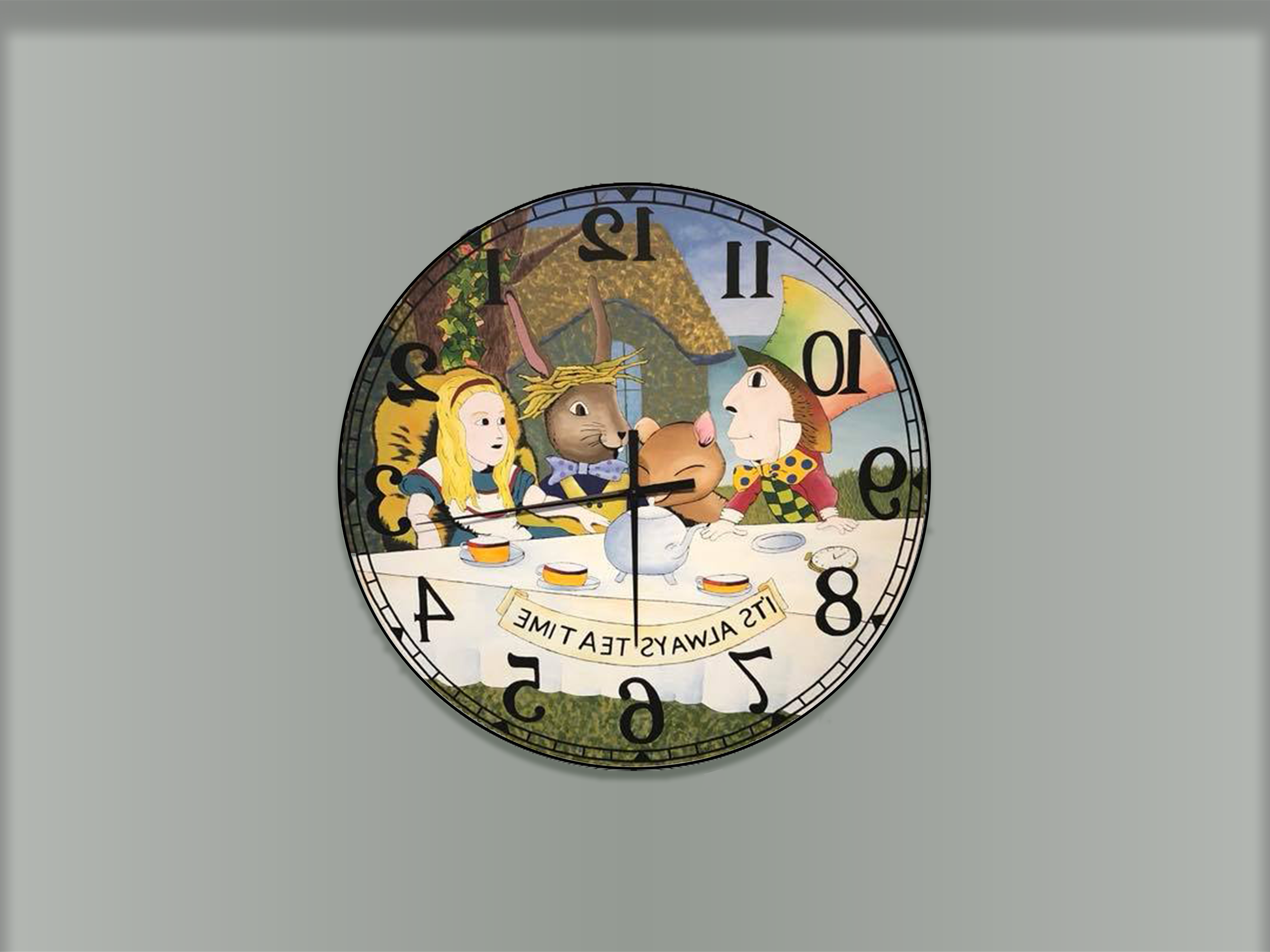 This hand painted, fully functional reverse clock depicts the classic Alice in Wonderland tea party scene. This piece is comprised of a 48”x48” acrylic hand-painted art board with lightweight foam backing, wood framework, with brushed nickel metal edge and matte black clock arms. Keep mad time with backwards painted numbers and reverse clock mechanism. This piece is equipped with heavy duty wire fixed to the frame for easy hanging. A truly unique, functioning piece of art ready to suit your space!